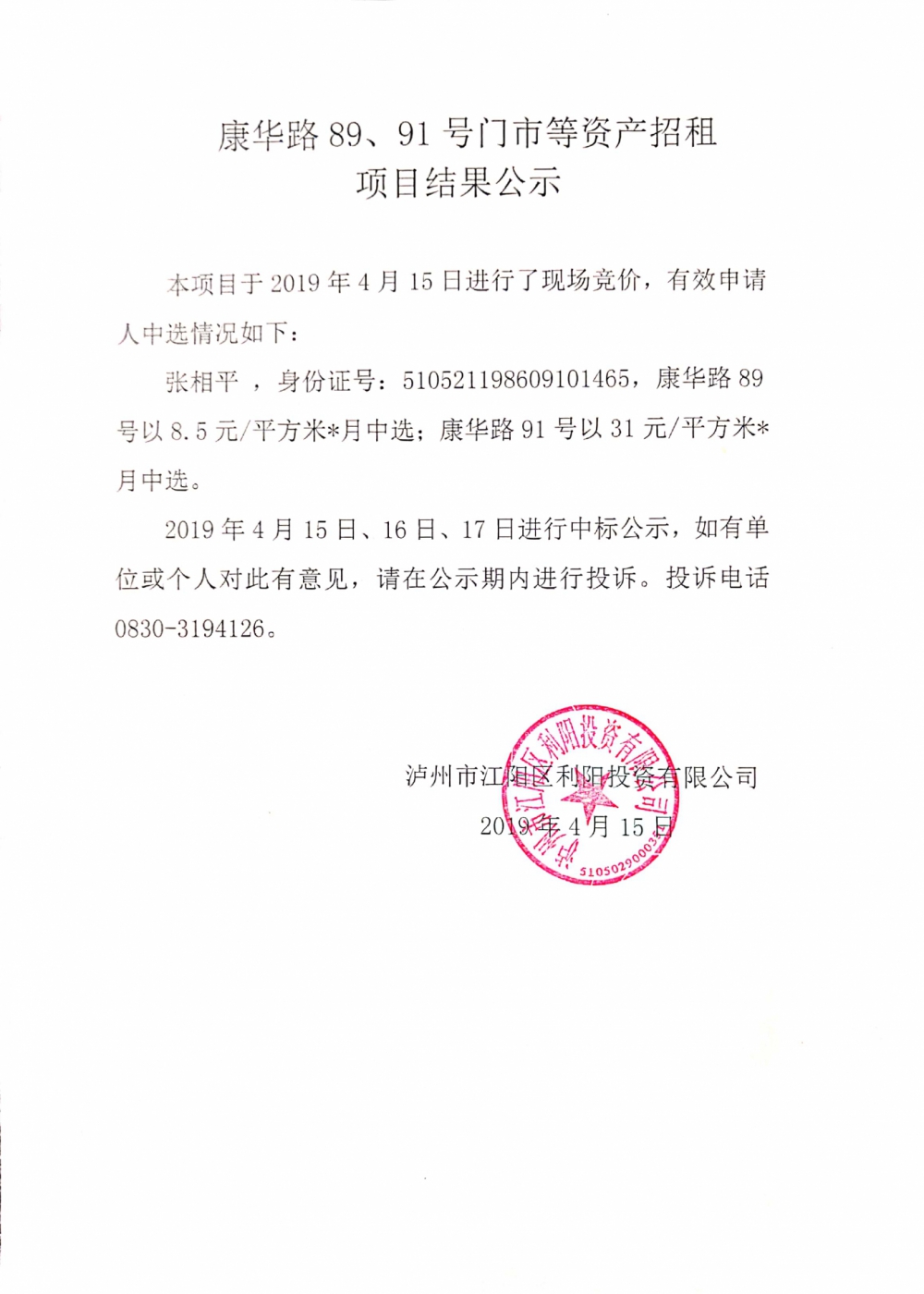 康华路89、91号门市等资产招租项目结果公示
