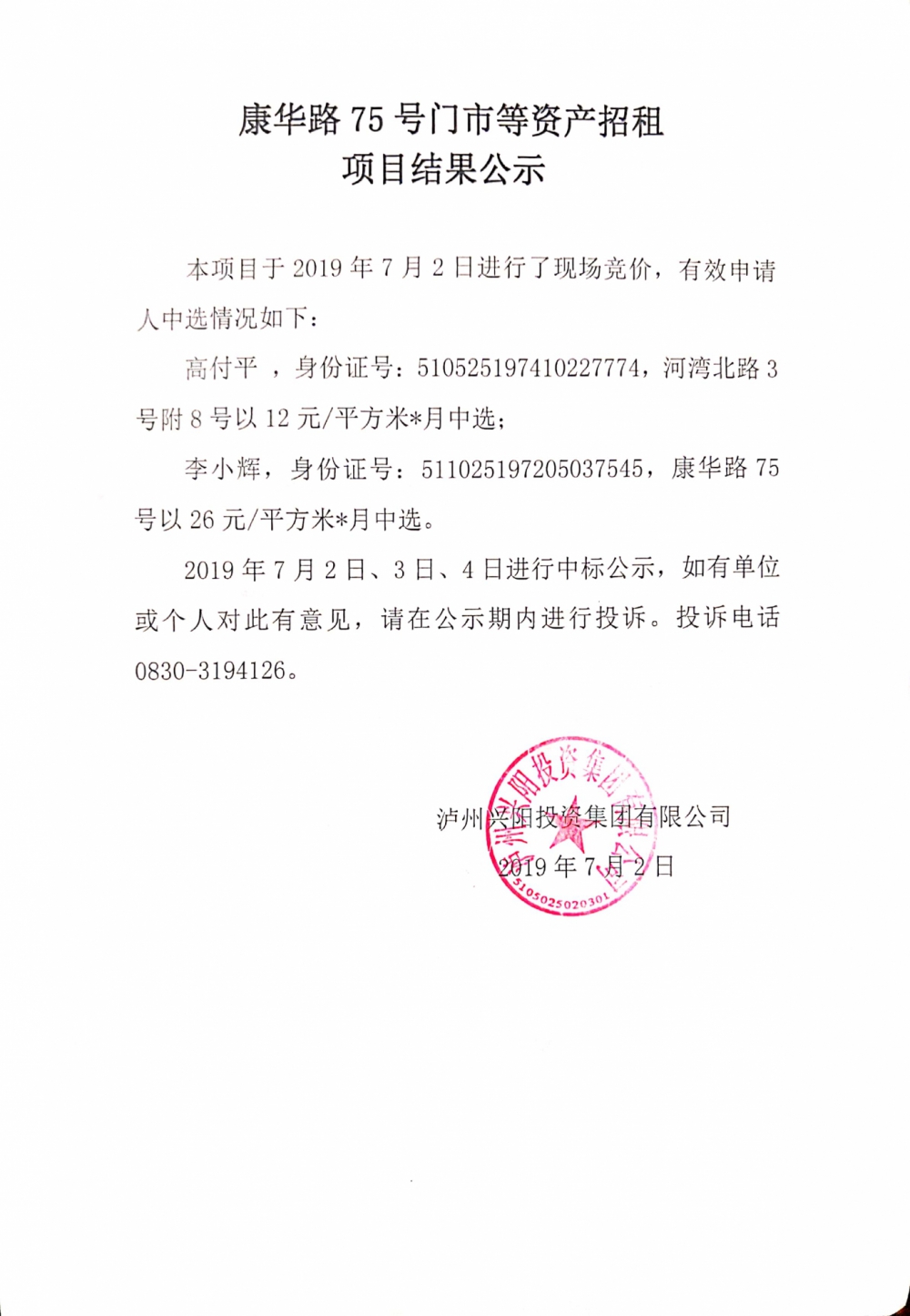 康华路75号门市等资产招租项目结果公示