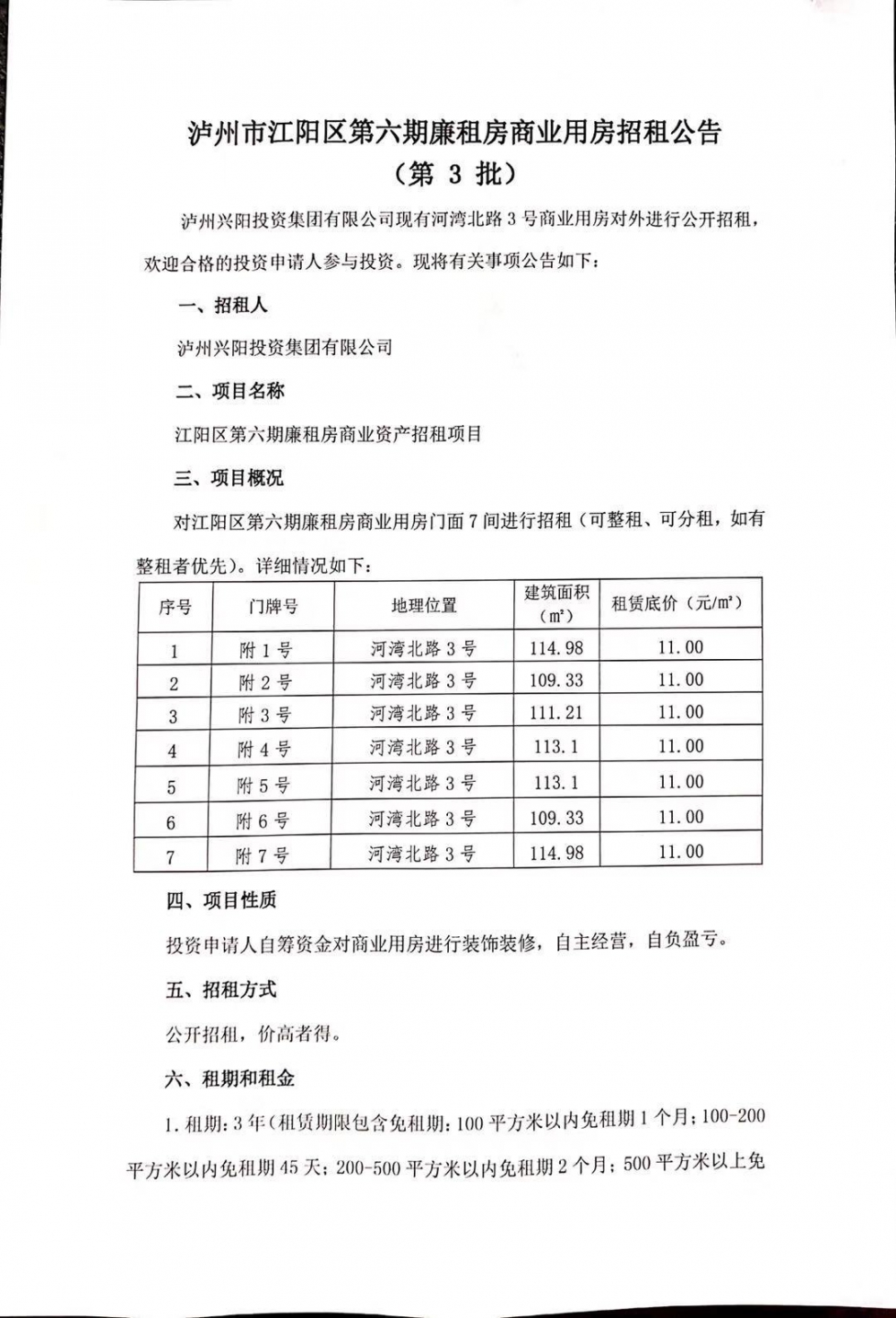 泸州市江阳区第六期廉租房商业用房招租公告(第3批)