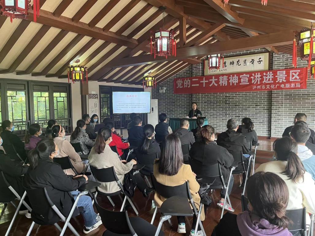 近日,泸州市文化广电旅游局在张坝景区开展党的二十大精神宣讲活动。市局党组成员、副局长李小蓉作为宣讲员,为景区党员干部职工、游客宣讲党的二十大精神。
