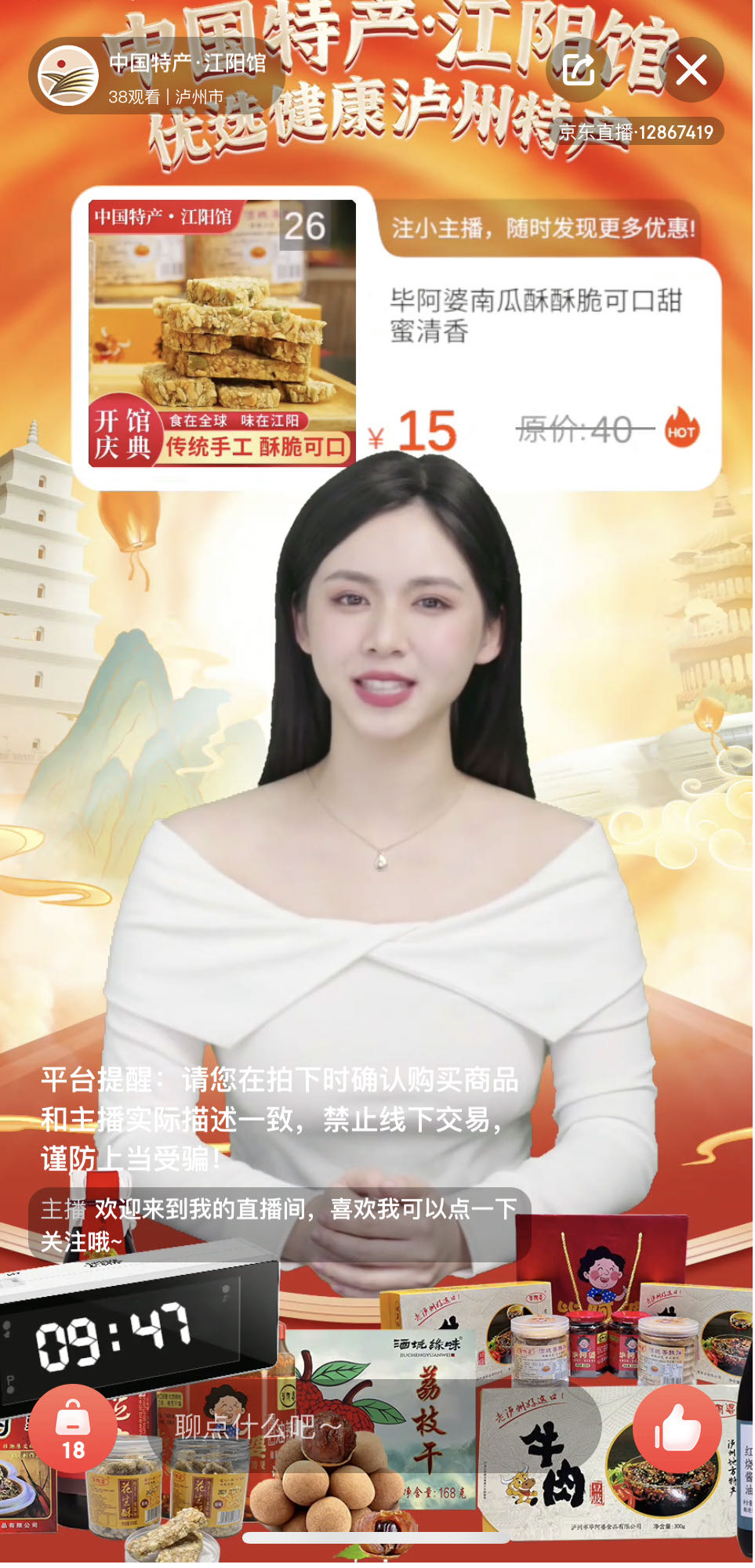 点击京东进入“中国特产·江阳馆”直播间,AI主播“媛媛”正热情地向大家介绍着泸州特产。