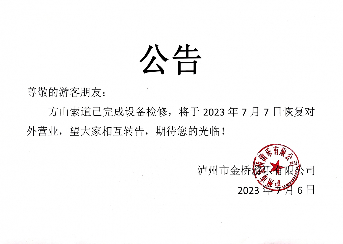 方山索道已完成设备检修,将于 2023 年7月7日恢复对外营业,望大家相互转告,期待您的光临!